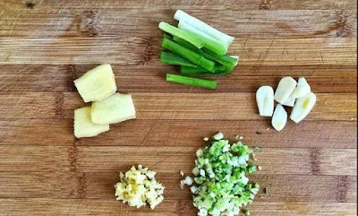 🍪 Clean the scallions and cut one into small pieces, and one into long pieces for later use. Cut 3 pieces of ginger to reserve, then cut an appropriate amount of minced ginger, peel the garlic and cut the garlic slices.